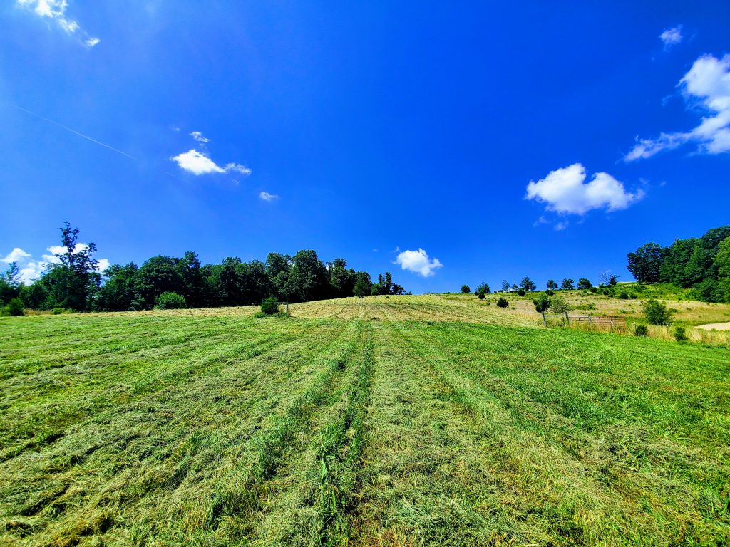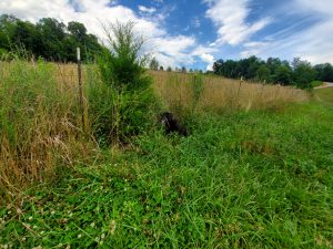 With June coming to a close and the mowing (relatively) under control we set our sights on expanding the amount which could be mowed. The “barn” field had a 200 foot welded wire fence at one end which separated the lower barn field from the upper section which was approximately 700 x 200 feet wide. The first thing was for Pokey to pull out the 20+ T posts so we could wrap and salvage the welded wire. Here is Bun doing a pre-inspection of the posts
