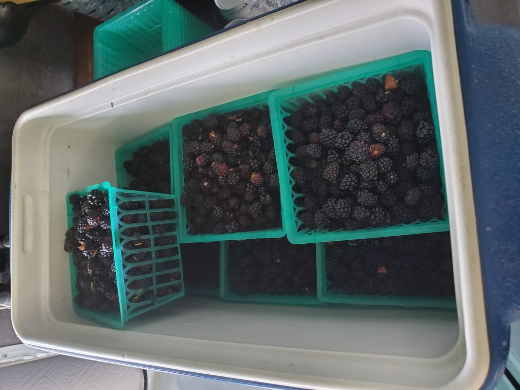 With 51 acres mowing is always on the mind, but the end of June/beginning of July is also blackberry season! We have large tracts of blackberries growing on the property. This was the first harvest – approximately 4 hours of picking yielded a large cooler full of blackberries!