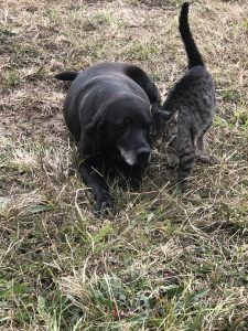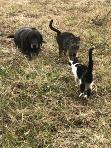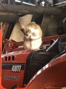 Between rain showers we got out and walked the driveway and talked about landscaping ideas. We stopped at the barn to feed the cats. We have four now. A calico which appears to be a little bit bigger than the others. The other three are two black and white and one gray tabby. They are definitely juveniles, and if I had to guess, all from the same litter. For now, it appears they are all female as far as I can tell. They are also much more friendlier than the calico. She is very skittish.