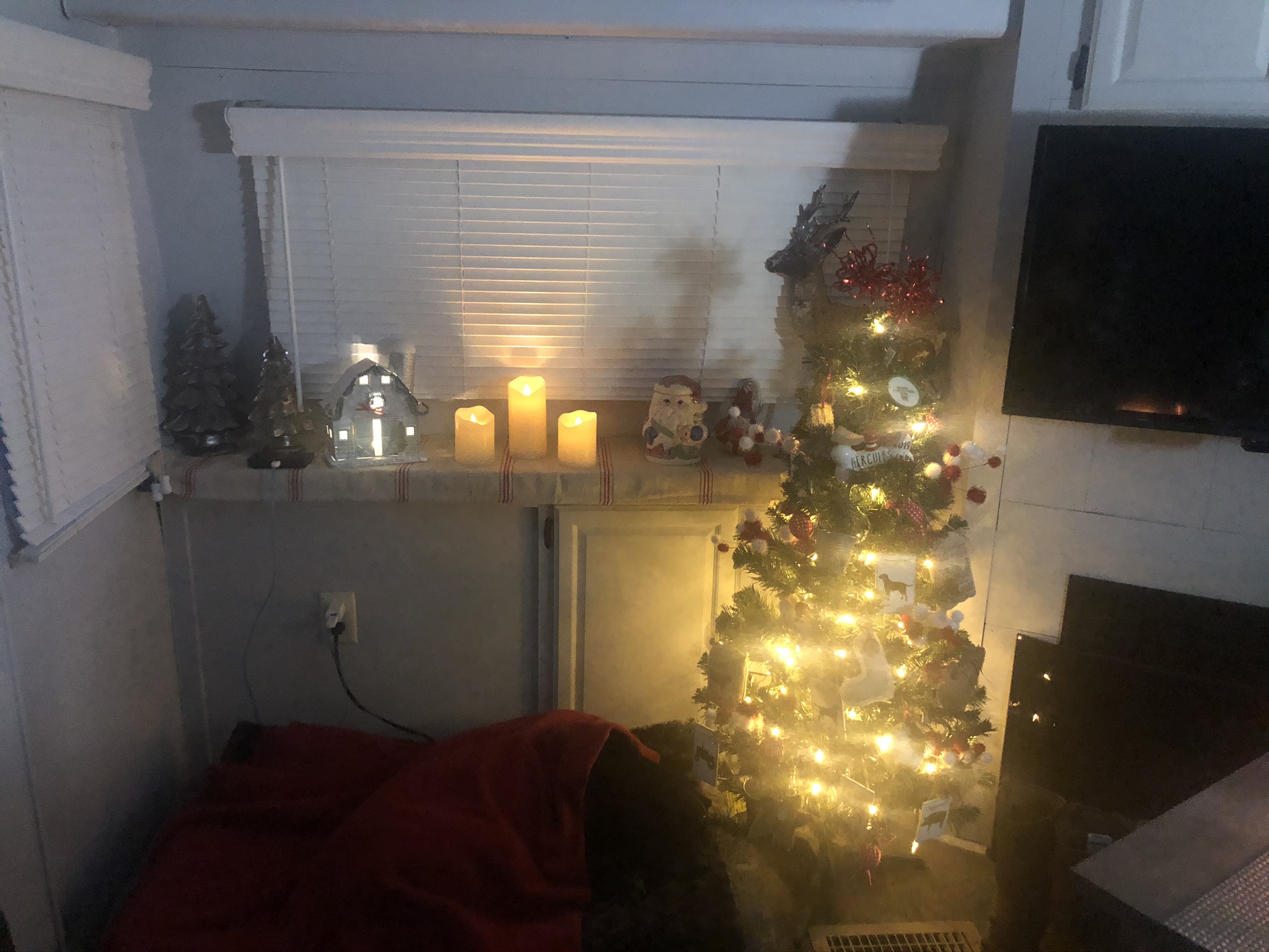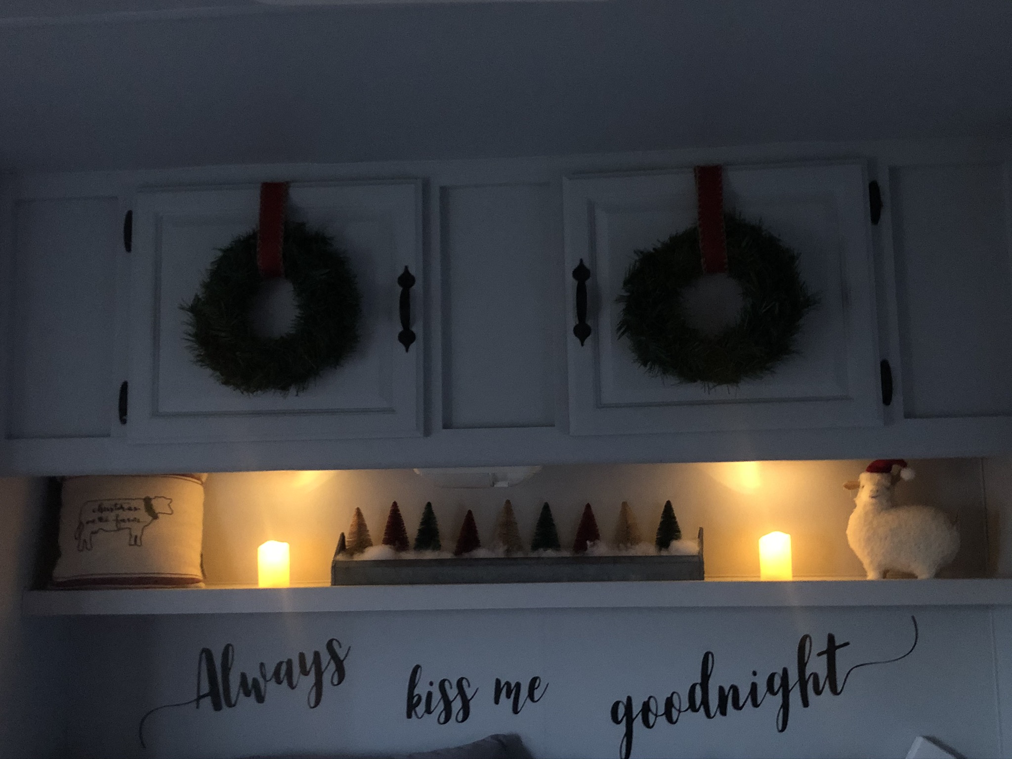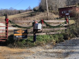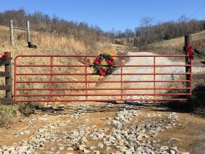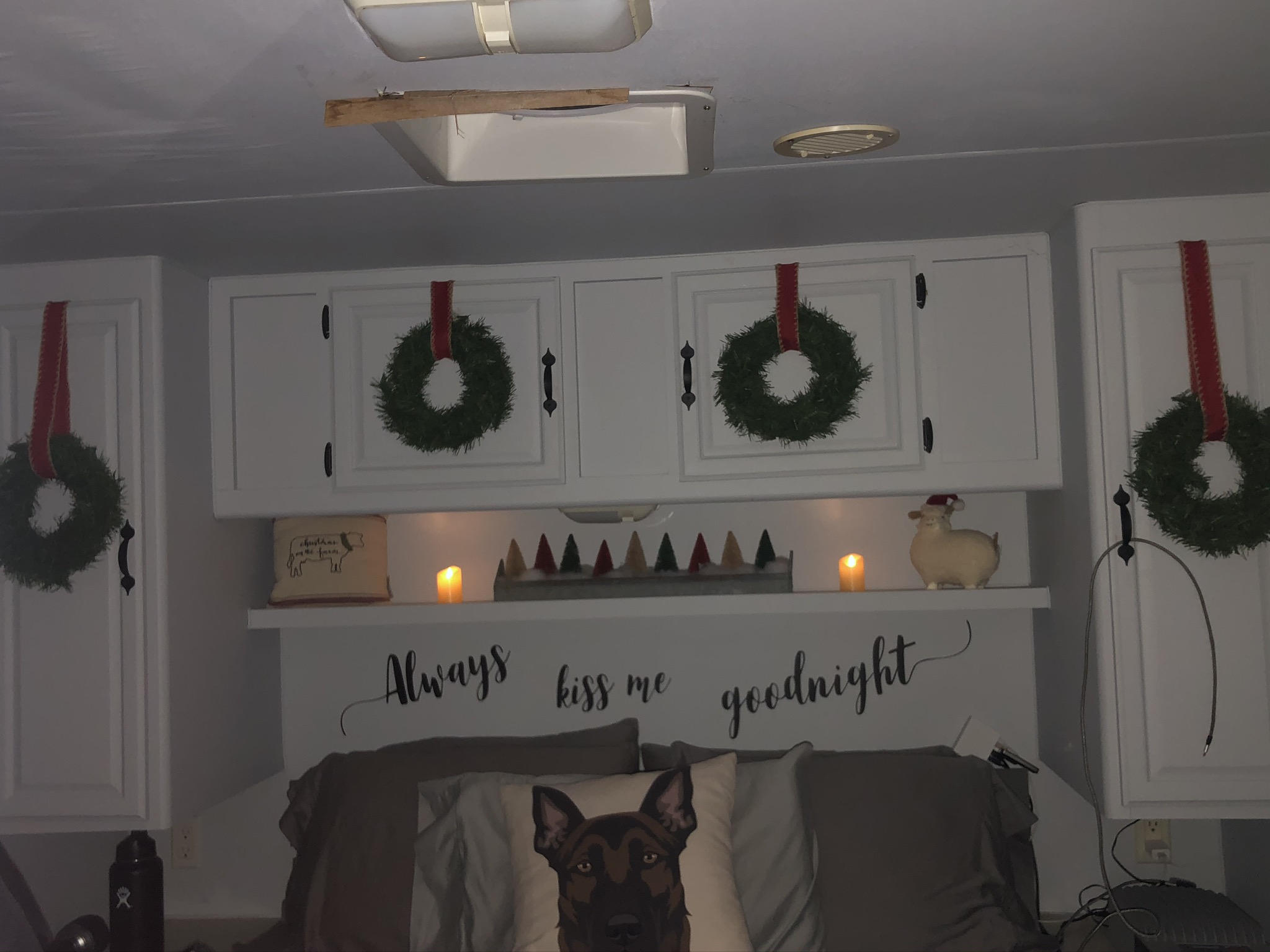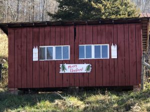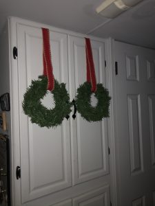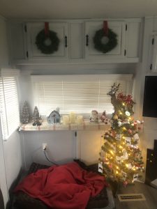 Al left yesterday.  I will stay until Friday the 13th then Al will relieve me.  I probably won’t return until after Christmas.  It’s just plain difficult right now.  I miss the dogs here.  I miss the dogs there.  I miss my husband.  I miss the peacefulness here.  I miss my girls back home.  For the first time ever, I do not have a Christmas tree nor am I able to put up any decorations at home. If you know anything about me you know I live for this time of year! It has not been easy but, I do know that Christmas is much more than decorations.  Christmas, or anything in life really, is all in how you choose to look at it.  It IS what you make it.  So, I improvised and decorated here! Al hung lights on the RV and placed some in our his and her trees out in the front field.  What looked like 3 foot trees are actually about 25 foot trees!  So, Al just kind of abstractly hung them and to our surprise the lights resemble an angel!   We strung garland and hung bows and a wreath at the front gate along with our tobacco sign on the shed.   I also made a 2′ X 2′ barn quilt wreath for my barn.    I even put a small tree up in the RV with a few decorations I brought from home.  That’s my new chicken feeder I purchased awhile back stuffed with brush trees. I brought homemade pumpkin bread from home to all the workers.  I left cookies in the mailbox for our carrier.  I brought a chunk of gifts from home to wrap and I have been playing Christmas music throughout.  I honestly cannot complain.  It’s been cozy and peaceful and I am filled with the Christmas spirit.