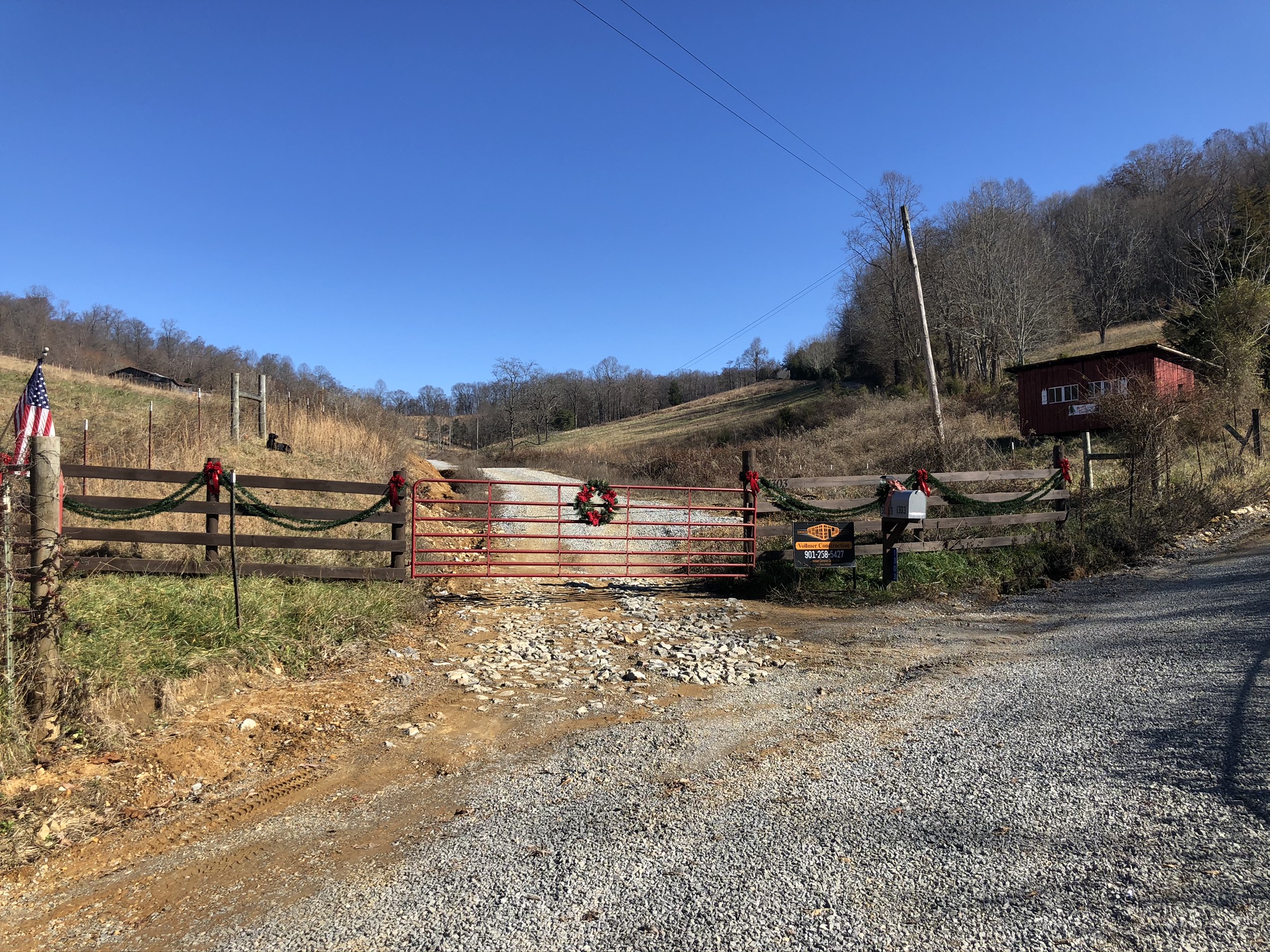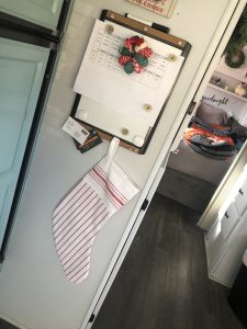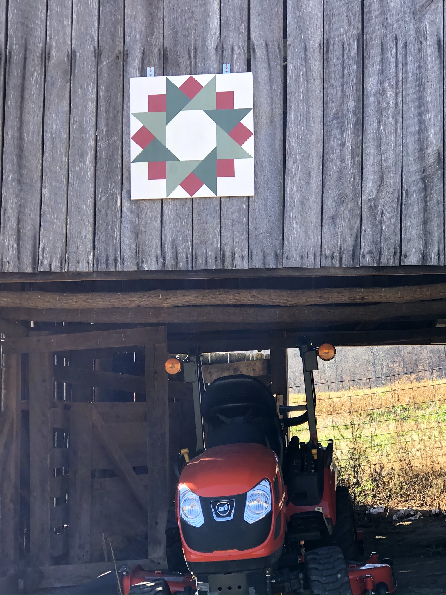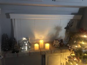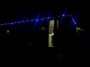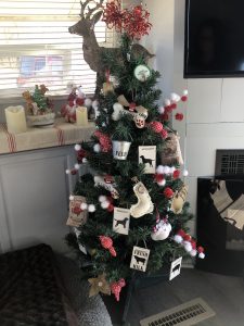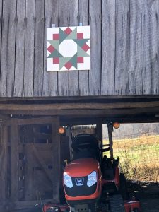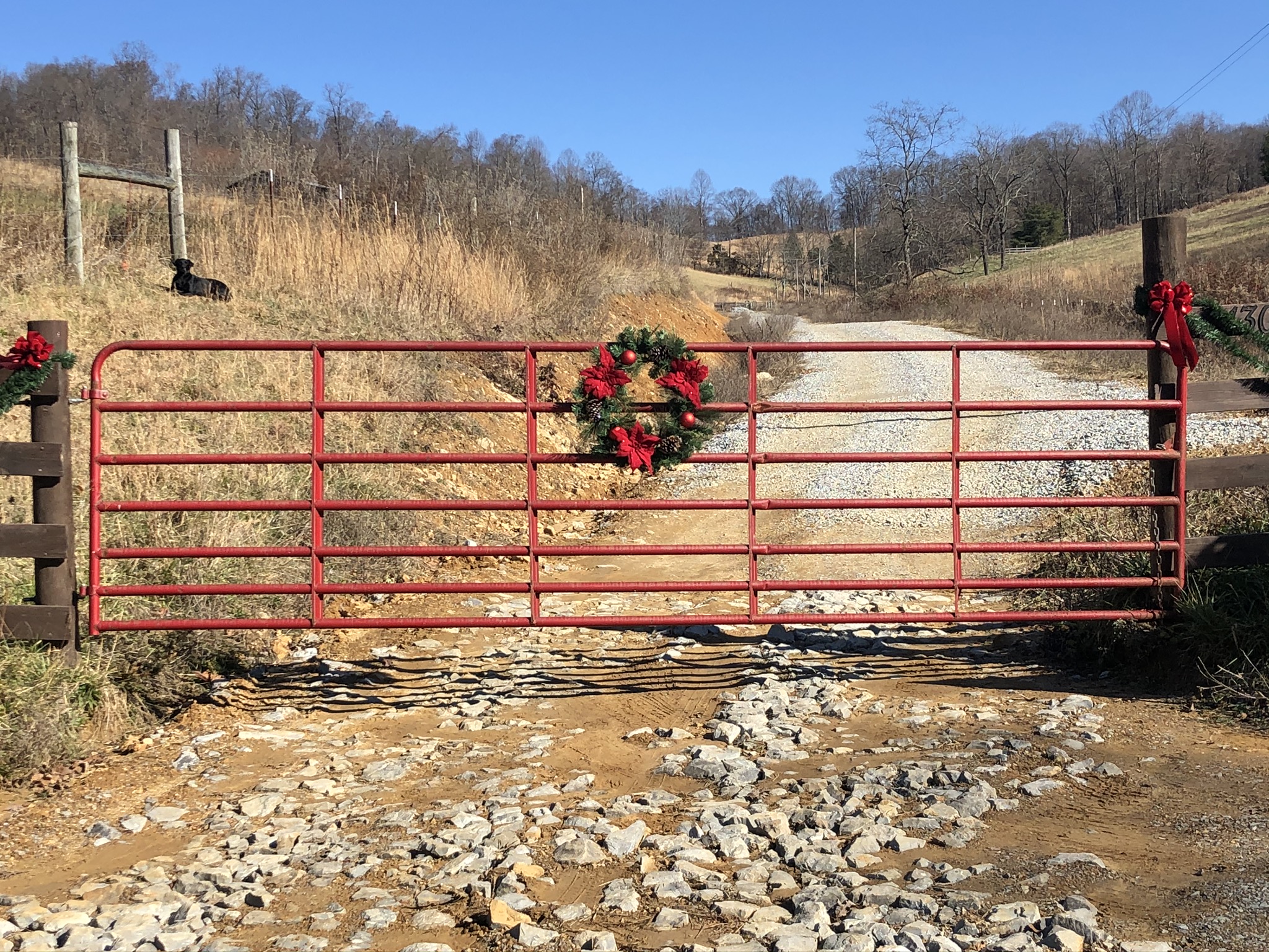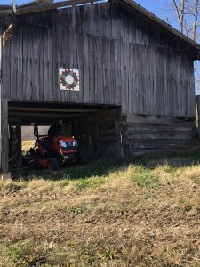 Al left yesterday.  I will stay until Friday the 13th then Al will relieve me.  I probably won’t return until after Christmas.  It’s just plain difficult right now.  I miss the dogs here.  I miss the dogs there.  I miss my husband.  I miss the peacefulness here.  I miss my girls back home.  For the first time ever, I do not have a Christmas tree nor am I able to put up any decorations at home. If you know anything about me you know I live for this time of year! It has not been easy but, I do know that Christmas is much more than decorations.  Christmas, or anything in life really, is all in how you choose to look at it.  It IS what you make it.  So, I improvised and decorated here! Al hung lights on the RV and placed some in our his and her trees out in the front field.  What looked like 3 foot trees are actually about 25 foot trees!  So, Al just kind of abstractly hung them and to our surprise the lights resemble an angel!   We strung garland and hung bows and a wreath at the front gate along with our tobacco sign on the shed.   I also made a 2′ X 2′ barn quilt wreath for my barn.    I even put a small tree up in the RV with a few decorations I brought from home.  That’s my new chicken feeder I purchased awhile back stuffed with brush trees. I brought homemade pumpkin bread from home to all the workers.  I left cookies in the mailbox for our carrier.  I brought a chunk of gifts from home to wrap and I have been playing Christmas music throughout.  I honestly cannot complain.  It’s been cozy and peaceful and I am filled with the Christmas spirit.