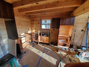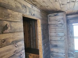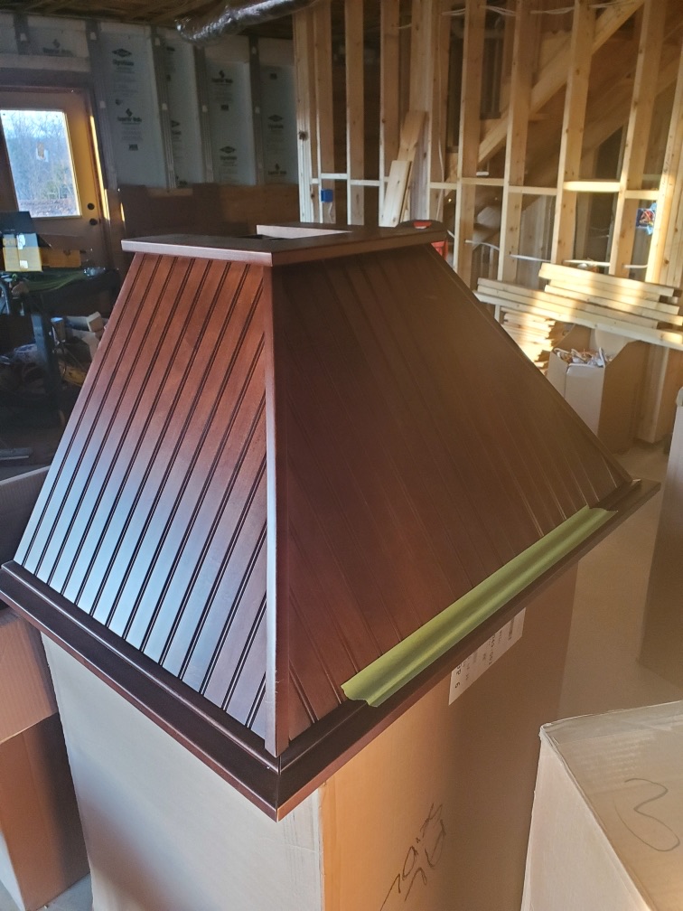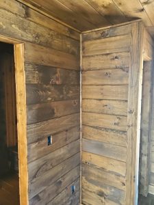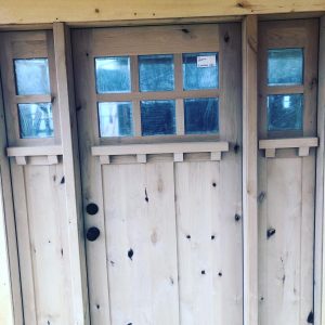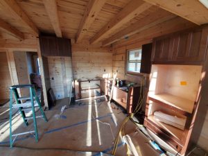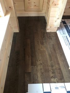 Much has happened with the cabin over the past few weeks!  It’s beginning to look more and more like it may actually get finished soon!  Framers have been focusing a lot on trim work.  In a cabin there is A LOT of trim work.  Floors are being laid and even kitchen cabinets are being installed.     I was so excited to see the cabinets!  We picked them out back in August!  I almost forgot what they looked like!  The painter showed up the day I left to began the staining process.  Al sent me a few pictures.  I can’t wait to see it in person.  It’s so hard to imagine how all the colors will come together.  The stain, the cabinets and the flooring….but, I think it is going to look perfect!     It’s amazing how stain brings out all the character in the wood.  I just love it.  Oh, and I can’t forget the front door!  Obtaining this beast was not an easy task but, I insisted on this beauty.  Thanks to my wonderful husband he made it happen!!   I initially planned on painting it red but, after seeing it and the knots in the wood, it will be stained instead.