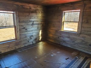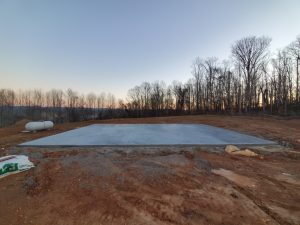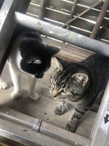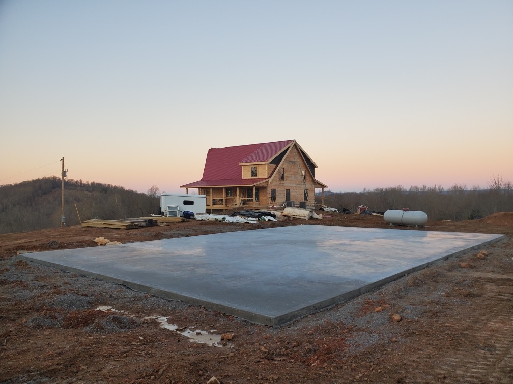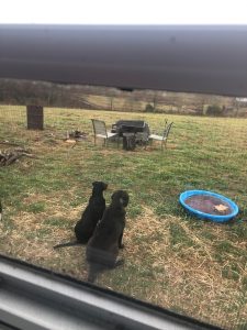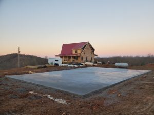 We finally finished picking out the light fixtures over the holidays and got them delivered to the cabin.  Sinks, faucets, mirrors have all been done as well.  I think we only need the counter tops and toilets at this point.  We’ve picked them at least.  I think all the picking and deciding is completed!  Thank God!  And, of course, I cannot forget Honey and Bun and the cats!!!    Honey sure knows how to sleep on her bed now.  One day she stayed in with me for most of the day!  Of course, it was raining and she had no inclination of getting wet.  Bun still insists on staying outside. One never gets a solid nights sleep there.  Bun barks, Honey wants out. Honey wants in, Bun barks, Honey wants out again.  It reminds me of having a new born baby in the house!  But, if this is the way it must be, then so be it.  The cats….we have five.  Three females and two males.  These are the males and the only friendly ones really.  We named them Chip (chocolate chip) and Zeb (Zebra stripes).  They love to be petted.  We walk to the mailbox and stop in at the barn to visit them daily.   The outbuilding (garage) foundation has been poured.  We hope to have it built in the next two weeks.  Once that is completed then, the moving can begin. We are finally seeing a light at the end of the tunnel!!  Finally!  The road has been a long one but, I know it will be so worth it!