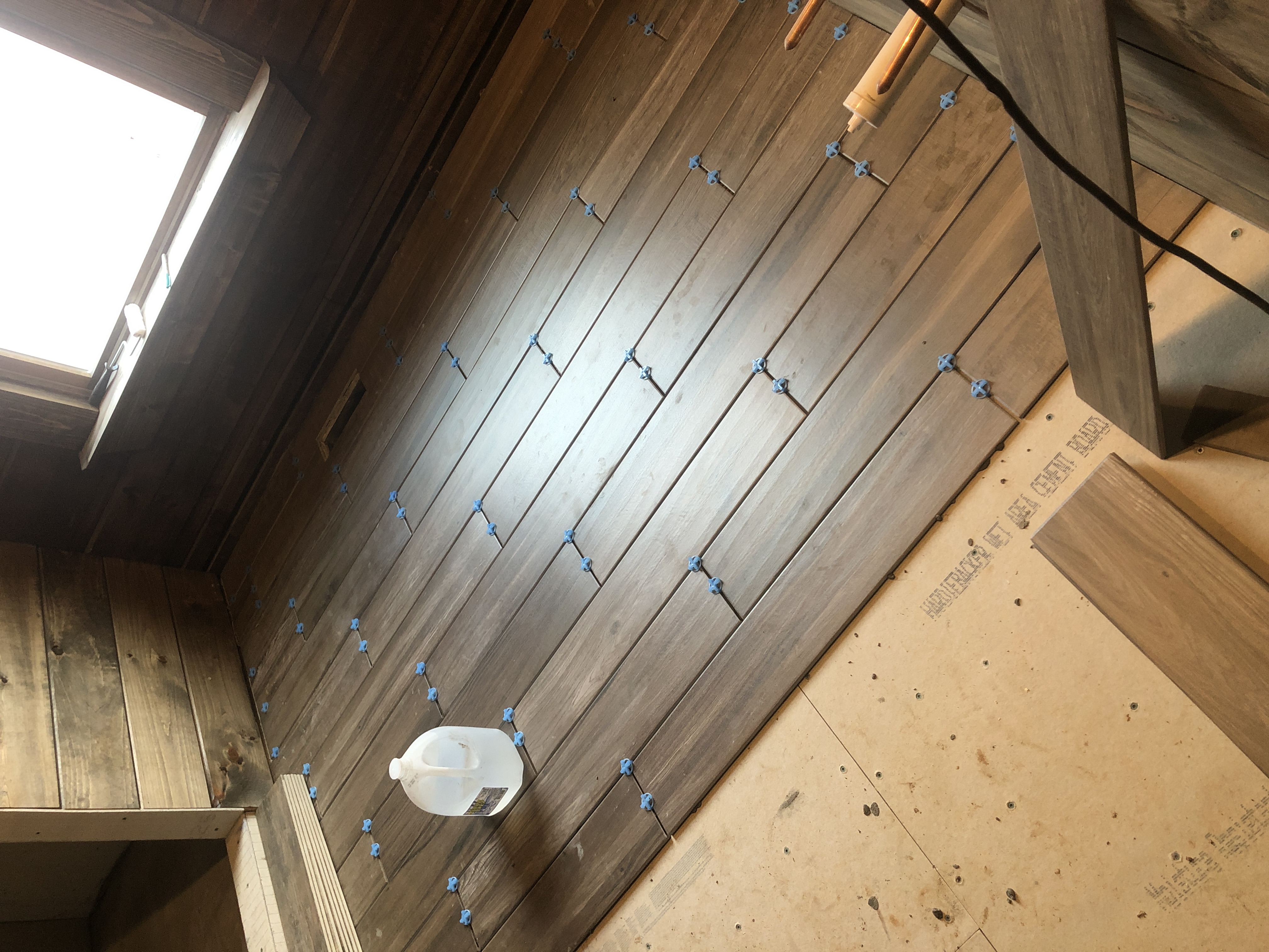 Tile is being laid in the master bathroom.