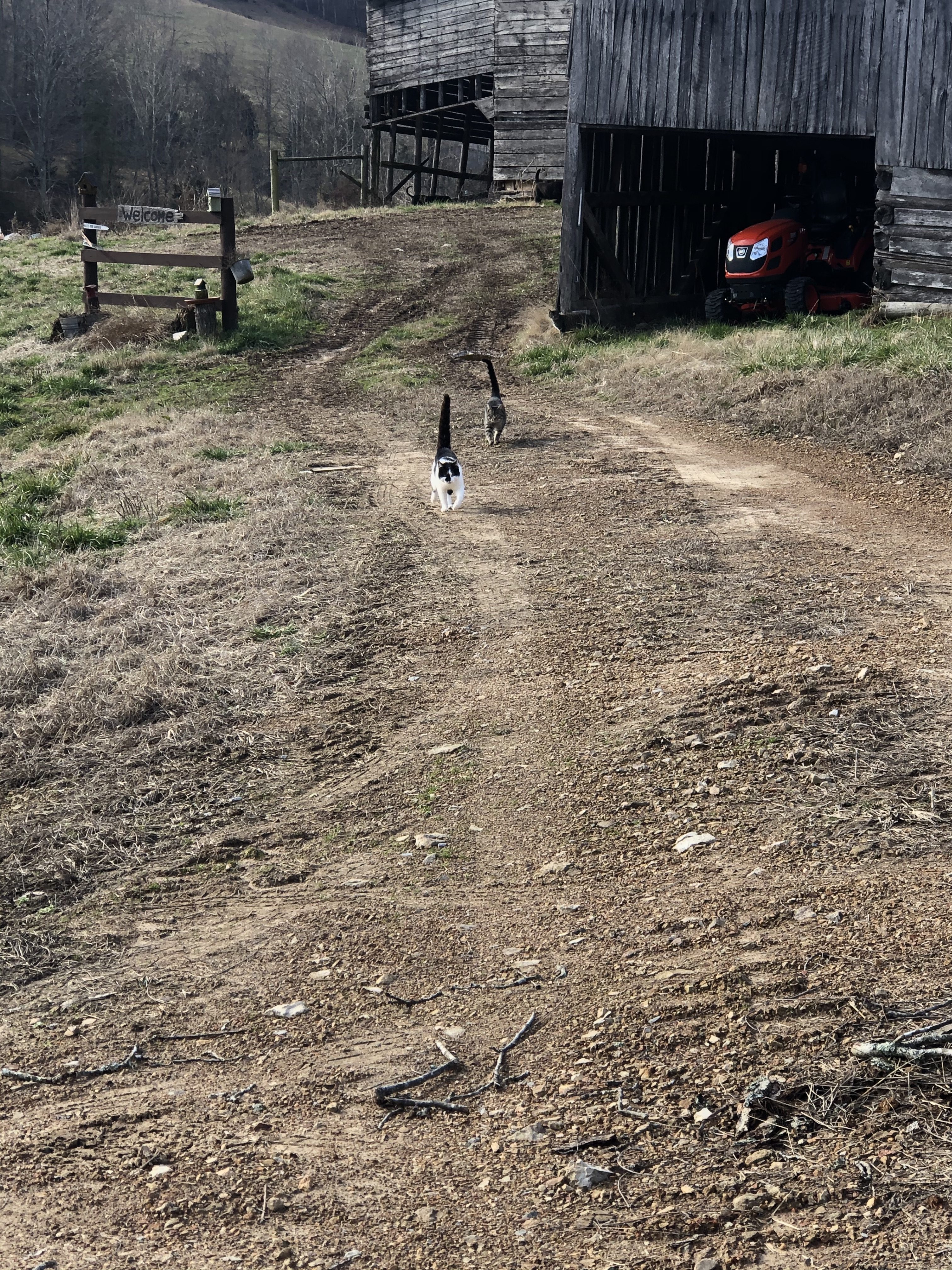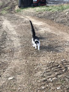 At this point I was thinking, to be safe, maybe I should just hibernate for the duration of my visit. Of course, I didn’t. I grabbed the keys and headed out to feed the birds and take a walk to the barn to check on and feed the cats. Those little boogers were apparently hungry. They actually came out to meet me! This is Chip. He is the friendliest and begs for your attention. He actually lets you pick him up. He also likes to try and follow you when you leave. I usually have to run away. He then loses interest.