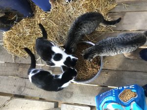 For now, this is our little litter. They look like two sets of twins. Each a female and a male. They are juvenile cats. There are others but, they don’t approach or make themselves seen when we are around. Would you believe that two days later I came back to check on them and all that food was gone?! That’s a huge bowl too! So, yeah, there have to be more cats around.