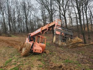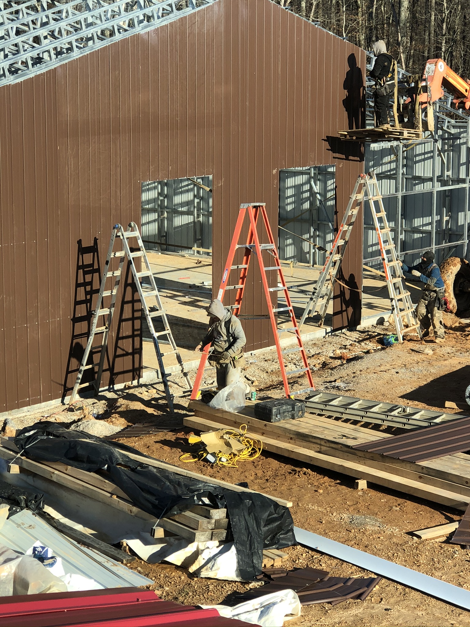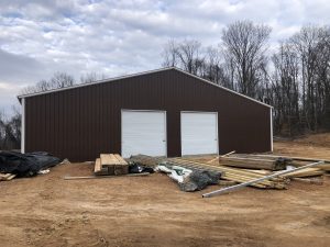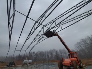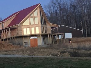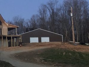 With Valentine’s Day approaching, Al and I had planned ahead so that we could spend some time together at the farm. Al had been at the farm for about a week prior to us both going up. While he was there the crew arrived to build/erect our outbuilding. This building is about 2400 square feet. It’s HUGE. It will be used as a garage for both vehicles, my tractor, storage for holiday decorations, etc. and the back part will be Al’s workshop. We also plan to build a small room complete with a doggie door on the side for Honey and Bun. You know it will be a very fancy dog room. 🙂 It rained a good bit while Al was there. I mean what is up with all this rain!!! The outbuilding crew came after the down pours but, the ground was still very soft. At one point the telehandler slid down a hill and practically got buried. Thankfully the excavator was able to pull it out! That could have been a disaster. This crew didn’t waste any time. They started on Thursday and were done by Sunday afternoon!