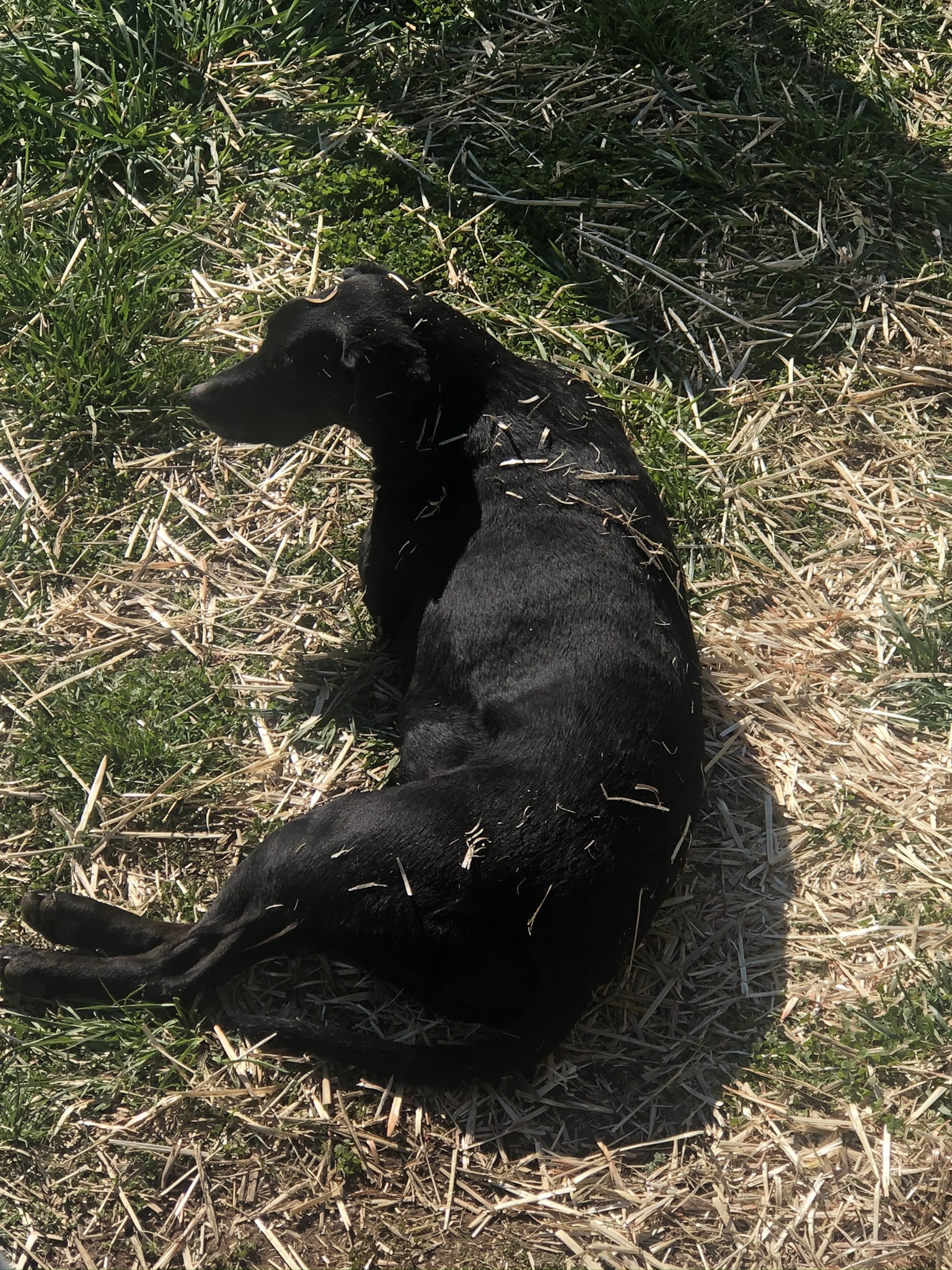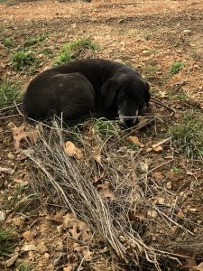 Sunday we worked outside. Thankfully the sun was shining. We again organized wood piles, tin for both roofs got stacked and we bagged up additional trash and non-burnable items. Al took a trip to the dump later in the day. The trailer was full! There were at least 18 to 20 bags of trash! It looks so much better now! Y’all, these dogs. Bun always wants to stay near us. She is seriously like velcro. Here she made a nice little nest to lay in while we worked around the cabin. Honey just preferred to lay in the hay by the RV and soak up a little sunshine.