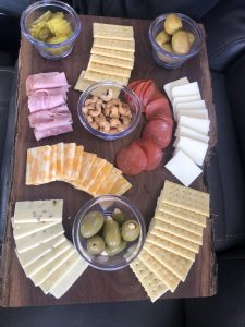 We took a quick lunch break and I got to use my new Charcuterie board that Al got me for V day. I had to get creative and use items we already had in the fridge. Al did manage to sneak in some cheese blocks without me noticing. It was delish and went well with a glass of wine. I plan on serving these a lot in the future. I don’t know why but, I’m just really into them right now.