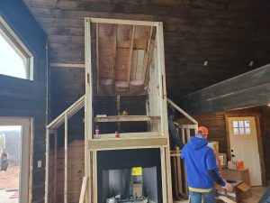 Hopefully this week, if the weather holds out, the fireplace will get cut through the roof and the pipes inserted and built. They are working on additional trim work throughout the cabin as well. We are having a few issues with our kitchen and bathroom cabinets. There are some missing fillers and a busted vent hood. We are still waiting on our interior doors to arrive as well. Next up will be the granite, sinks and faucets. Also, shower doors and toilets. One of the main things to get accomplished by Al is the fenced in yard. He needs some good weather though to grade. It looks promising on this trip.