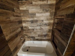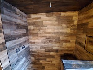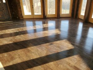 Right now within the cabin, the floors are complete, the tile floors and shower tile has been completed in all the bathrooms and all walls have been stained.