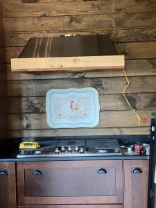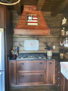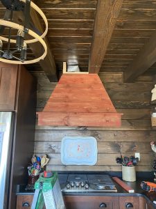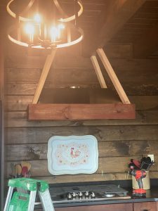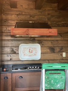 First, let me explain the nightmare we had with the oven vent. We purchased our cabinets from Lowes. We had to plan out each cabinet, each drawer, what direction they opened, etc. to verify and ensure that everything would fit just right. The kitchen, for me, was the most important room in the cabin. As most of you know, I love to cook, to bake, and to get creative in the kitchen. So, it was really fun and important that I was able to design it myself. The lady at Lowes that helped me accomplish this did an amazing job. However, the brand we purchased (Schuler) was not very impressive with their communication skills. When we initially received the cabinets we noticed the vent hood was cracked. So, they said they would replace it. MONTHS later we get what we think is the hood but, upon opening the box, we saw that they had sent us the insides of the vent. MONTHS later we finally received the actual hood. This was before COVID-19, too. So, no excuse. When Al went to install it we realized it would not fit well next to the beam above it. If we did make it work it would have been too low leaving little space to comfortably use the stove top. So, we got creative and just built one ourselves! (Anybody want to buy a Schuler oven vent?) It turned out better than I imagined. The stains consists of a dark walnut and a red overlay. Then, we wiped over the stains with water. They turned out perfect. There is enough dark red to match the cabinets and enough wood grain to go with the walls. I felt that staining it the same color as the walls would have made the hood blend right in to the wall. I really wanted it to stand out.