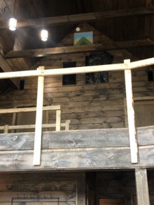 In late June both guestrooms and bathroom had been completed so, we moved on to the loft area.   We only had contractor grade stairs and literally 2 x 4’s used as the railing.  It’s what got us through inspection but, Lord, what an eyesore.    I was so happy to finally get some much prettier and safer rails installed.  But, as with most projects and tasks, it came with a price and I’m not talking monetarily.  I believe I stained over 142 rails!     Staining has become very zin to me these days.  :-/ Above the loft was a large return vent and beside it a very big hole.  If you look at the first picture above you can kind of see what I am talking about.  The HVAC unit is stored up in this little space.  I mentioned awhile back that I was thinking of making this space my office.  Well, once the gigantic HVAC system was installed that was a big ‘no can do’.  So, I wanted to get creative with the hole and how it would get covered, as well as, how in the heck could I cover up an ugly return vent.  When looking up there from the main floor I knew it needed to be eye catching. Al and I put our heads together and decided to build a set of barn doors.  The door covering the vent stands out about three inches from the wall to allow proper air flow.  The other door opens and closes to give us complete access to the HVAC unit and, as an added bonus, we can store some random items in that space as well.  I hung some wreaths up on the doors during the Christmas season.  I loved them there so much I believe I will let them stay for now.  The barn quilt above the doors was installed very early on after our move.  We have since added a light above it.    We are so happy with how it turned out.   We still need to add some trim and a handrail for the stairs. Other than those items, the upstairs is pretty much complete!